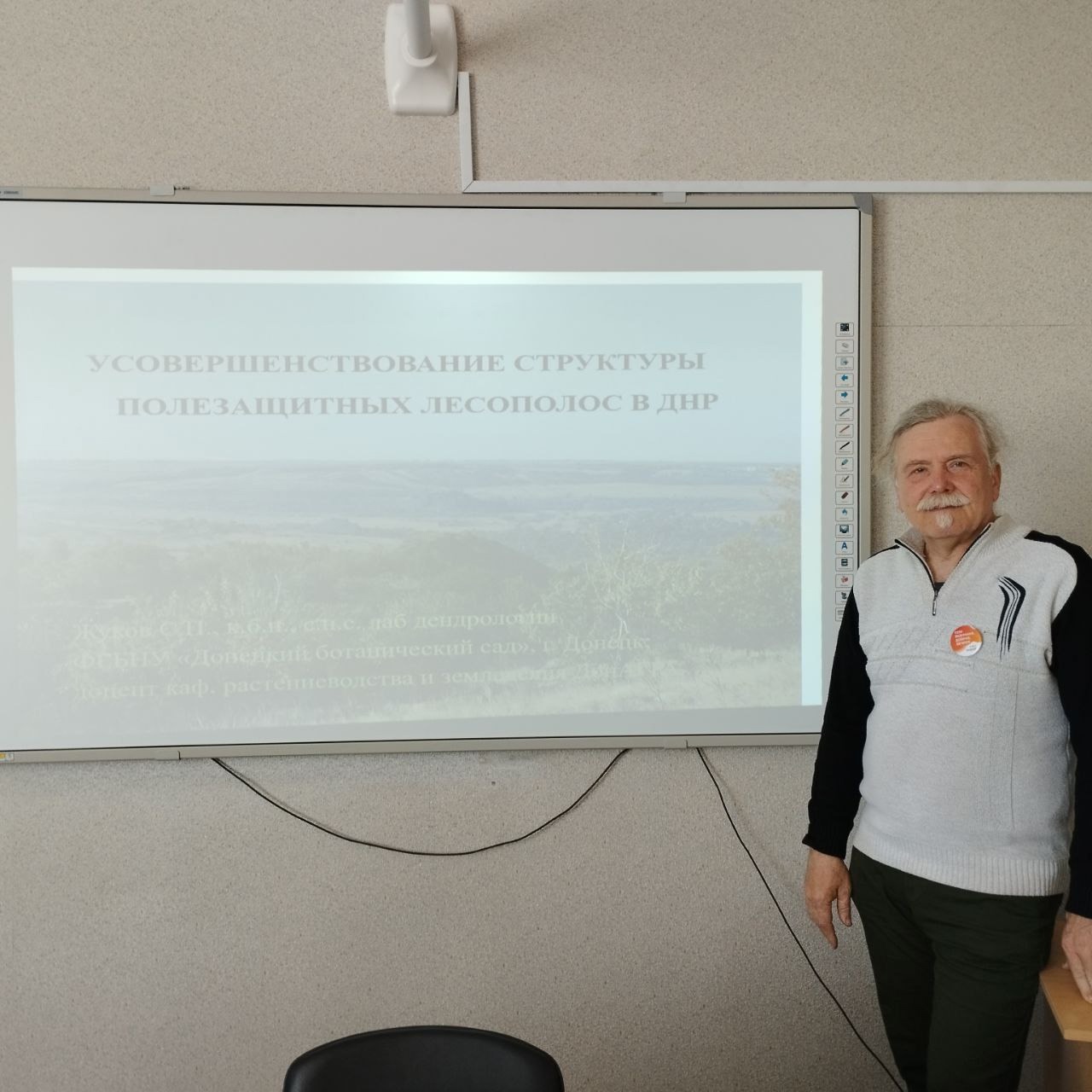 Учёный выступил на секции «Перспективные направления развития новых технологий в агрономии» с докладом на тему «Усовершенствование структуры полезащитных лесополос в ДНР», рассказал о текущем снижении функционального состояния лесополос вследствие возраста и изменившихся климатических реалий и необходимости их реконструкции для восстановления как пространственной структуры, так и устойчивости, с использованием новых перспективных видов древесных растений, испытанных в коллекциях Донецкого ботанического сада.