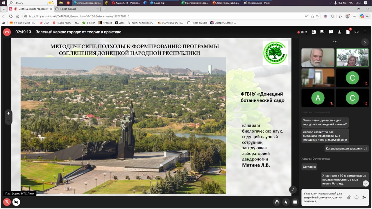 К.б.н., в.н.с. Митина Любовь Викторовна выступила с онлайн-докладом на тему «Методические подходы к формированию Программы озеленения ДНР», в котором представила информацию о пяти классических методологических подходах, использованных в формировании Программы: проблемно-целевой, системно-территориальный, нормативный, проектный и ландшафтно-экологический в различной степени представленности.