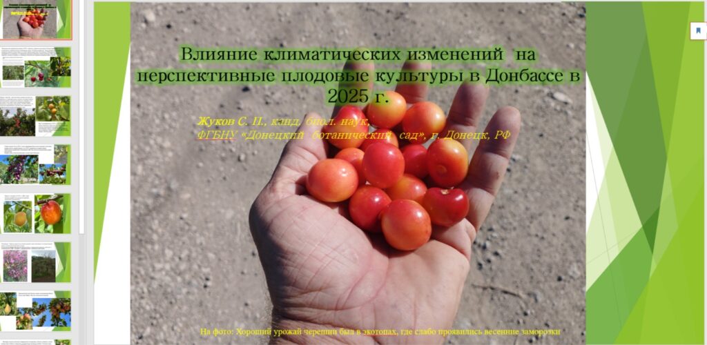 Жуков Сергей Петрович выступил на заседании секции «Физико-географические аспекты устойчивого развития государства и региона» с докладом на тему «Влияние климатических изменений на перспективные плодовые культуры в Донбассе в 2025 г.», в котором были освещены результаты сортоиспытания садовых культур, винограда, ряда новых для региона и малораспространенных плодовых растений в коллекциях Донецкого ботанического сада.