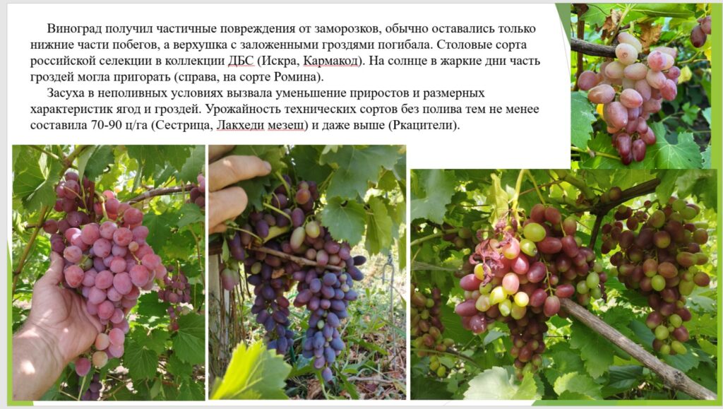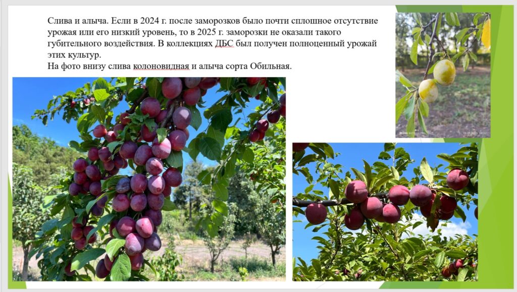 Несмотря на сложные климатические условия текущего года, а именно нестабильные температурные условия зимовки, раннее начало вегетации, возвратные весенние заморозки, экстремальная жара, засуха, пыльные бури, в коллекциях ДБС многие культуры показали хорошие результаты, более высокие, чем достигнутые в сфере плодоводства в некоторых более южных регионах.