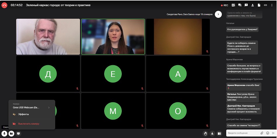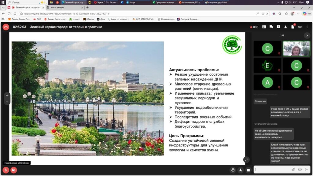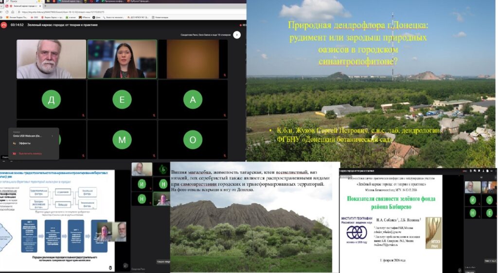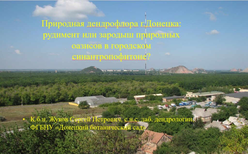 На заседании секции «Ядра, коридоры и капилляры зеленого каркаса города» к.б.н., с.н.с. Жуков Сергей Петрович представил вниманию коллег онлайн-доклад на тему «Природная дендрофлора г. Донецка, рудимент или зародыш природных оазисов в городском синантропофитоне?».