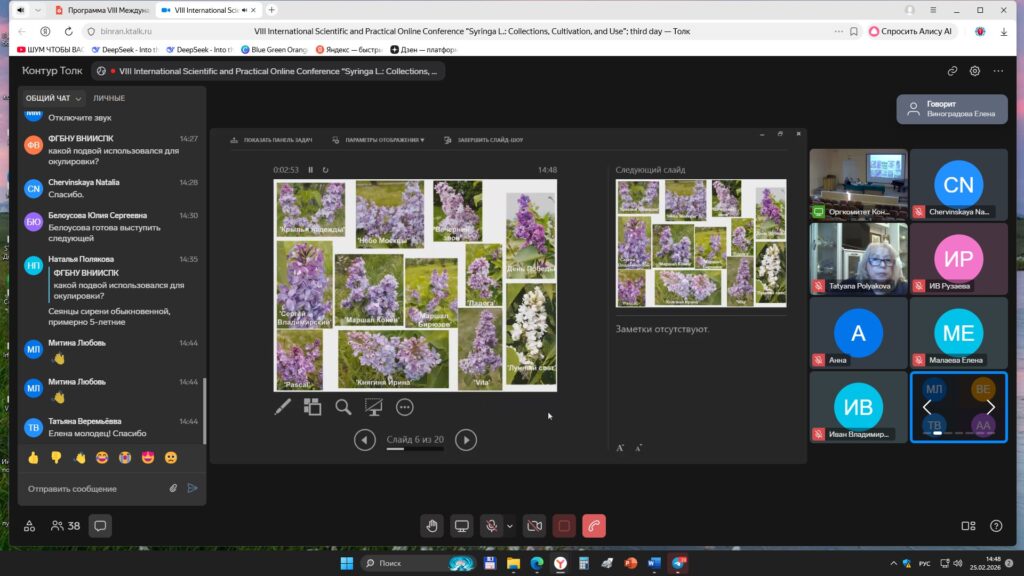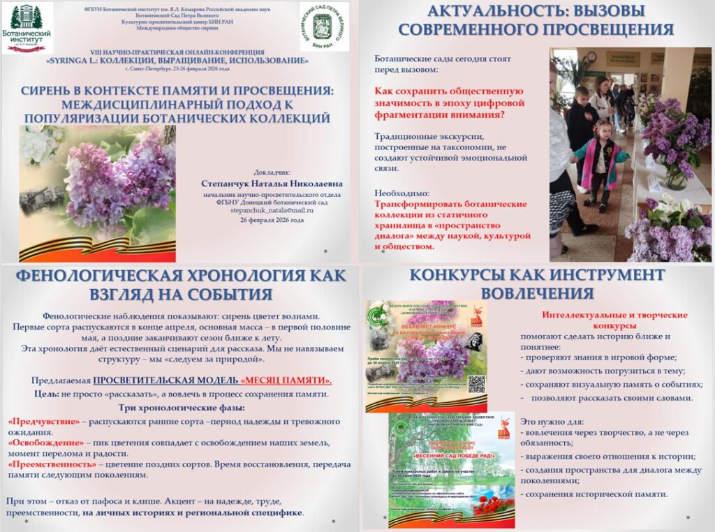 Начальник научно-просветительского отдела Степанчук Наталья Николаевна представила междисциплинарный подход к популяризации ботанических коллекций на примере рода сирени (Syringa L.) и предложила просветительскую модель «Месяц памяти», интегрирующую фенологию цветения, региональную историю и этичные практики коммуникации.